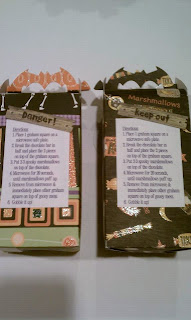 I had to make something ultra cute for my daughter to take in to her Fall party at school, but I wanted it to be something she could be involved in. The trick now is when sending food in to school for public consumption you cannot send in anything homemade. Too many allergies and other issues to consider. This makes it difficult for a child to "help" make treats. So, I found a cute idea while surfing the internet and we gave it a go. I was very pleased with the results! I cut out the treat boxes with my Cricut using the Batman cartridge. Then I designed and printed the "Spooky S'mores" label and directions on my computer. Makenna then used various pre-made die-cuts to decorate the boxes. Then we placed pre-wrapped bags of Halloween marshmallow and small size, individually wrapped Hershey bars into the boxes. The only tricky part of this treat was the graham crackers. They don't come individually wrapped. We wrapped four squares of grahams into plastic wrap, then copied the ingredients label off the box and printed them out on computer labels and used them to seal the crackers. These got carefully placed into the boxes as well. Makenna took great pride in the fact that she had "made" s'mores for her friends. I love it that she will have these fun memories of making projects with her mama.